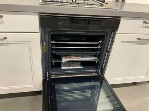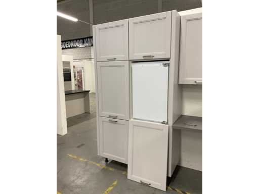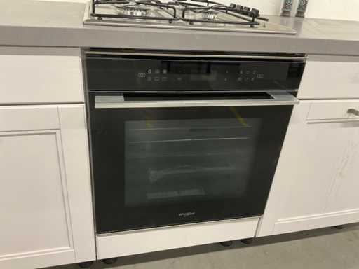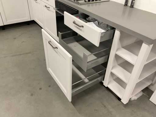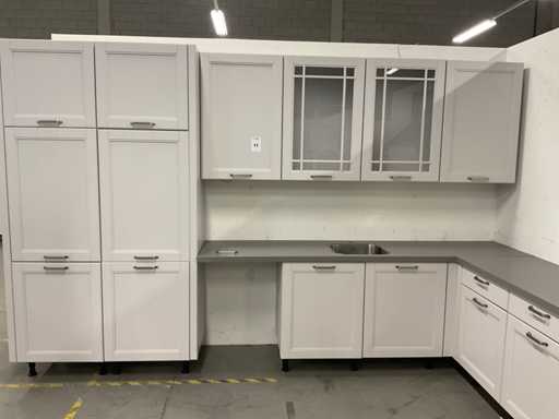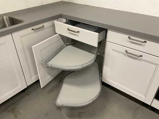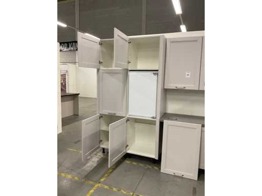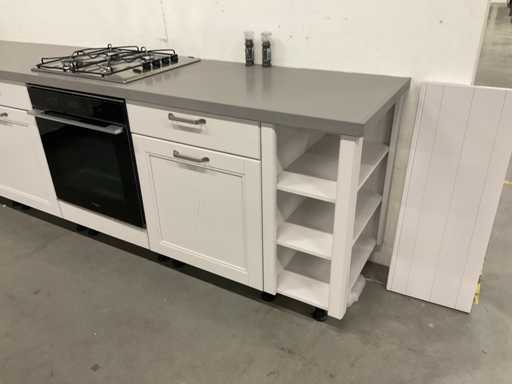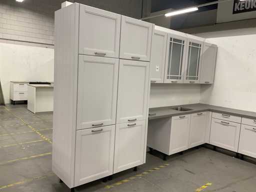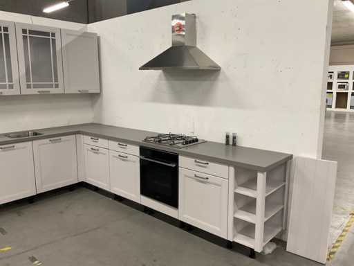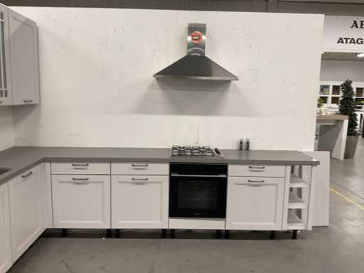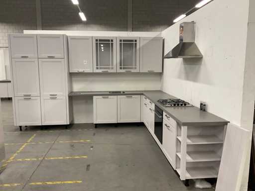 indeling: 2 onderkasten waarvan 1 met lade; 1 hoekkast met 2 uitzwenkplateaus; 1 onderkast met lade en binnenlade; regaalkastje; 2 hoge kasten; 4 bovenkasten; deurfront vaatwasser ontbreekt; Apparatuur: Indesit 4-pits inbouw gaskookplaat; type PAA 641; Indesit wandafzuigkap; type IHPC 9.4 AM X; Whirlpool inbouwoven; type W7 OM4 AS1BL; inhoud 73 liter; Bauknecht inbouwkoelkast; type KRIE 1001 A; inhoud 137 liter; Atag inbouwvriezer; type KS65088C; inhoud 95 liter; reeds gedemonteerd en ingepakt op pallets; werkbladen, plinten en hoge kasten niet ingepakt