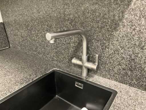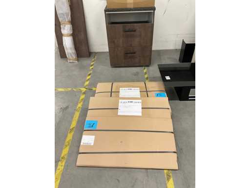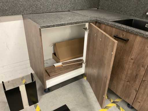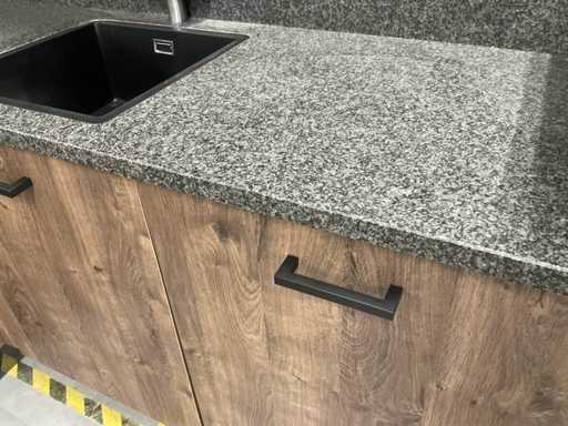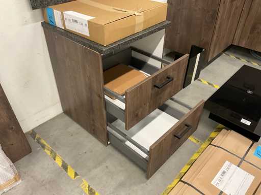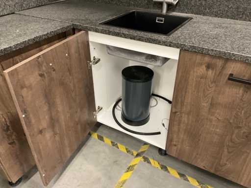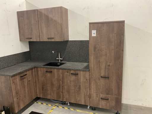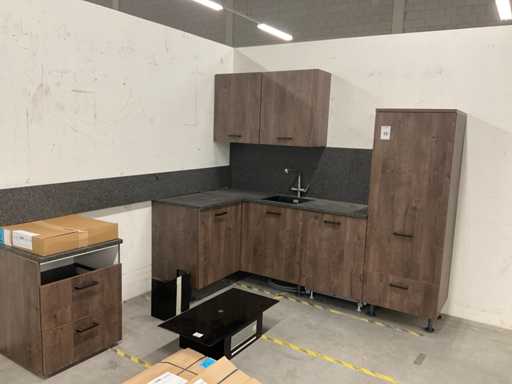 indeling: 1 onderkast; 1 hoekkast; 1 ladenkast waarvan 1 lade nog te monteren; 2 bovenkasten; Apparatuur: AquaHot; 3-in-1 kokendwaterkraan met reservoir; Bertazzoni wandafzuigkap; 90 cm breed; Bauknecht inbouwkoelkast; type KSI12VS1; inhoud 209 liter; Bauknecht inbouwvaatwasser; type BIO3T341 PL; reeds gedemonteerd en ingepakt op pallets; werkbladen, plinten en hoge kasten niet ingepakt