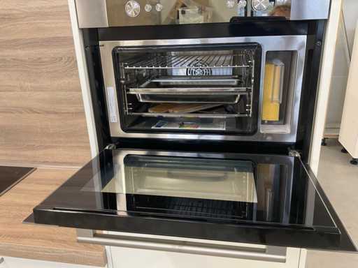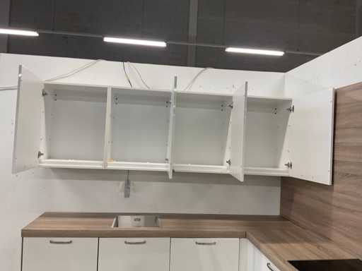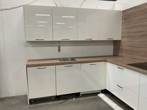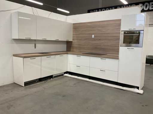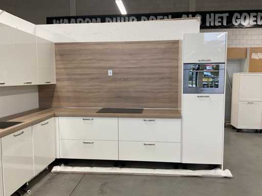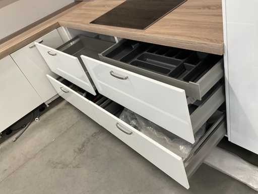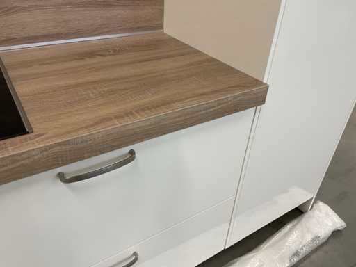 indeling: 1 onderkast; 2 ladenkasten waarvan 1 met binnenlade; 1 hoge kast; 4 bovenkasten; Apparatuur: Whirlpool 4-zone inbouw kookplaat; type AKT8330; Bauknecht inbouwstoomoven; type ECTM8145/1 PT; inhoud 29 liter; Whirlpool inbouwkoelkast; type ARG 100711; Whirlpool onderbouw vriezer; type AFB8281; inhoud 91 liter; Whirlpool inbouwvaatwasser; type WIC3B19; reeds gedemonteerd en ingepakt op pallets; werkbladen, plinten en hoge kasten niet ingepakt