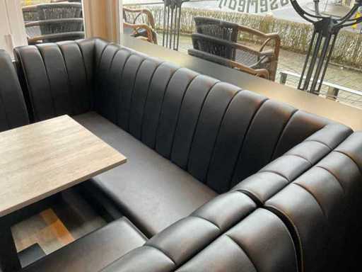 Bestaande uit 3 banken (totale afmetingen 495x70x100 cm) en 2 tafels (60x60x75 cm en 105x60x75 cm)