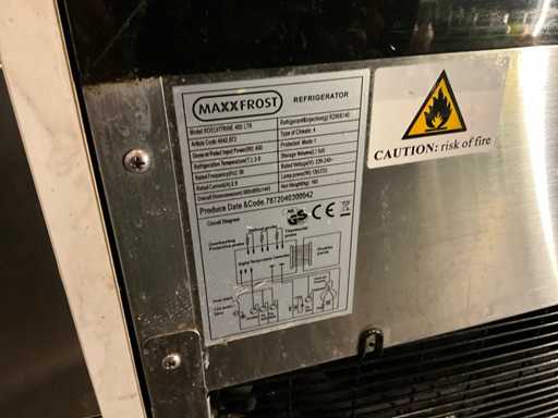1 x koelvitrinie (MaxxFrost) inhoud 400 ltr. / Afmeting: 900x805x1445 / eigen gewicht 180 kg