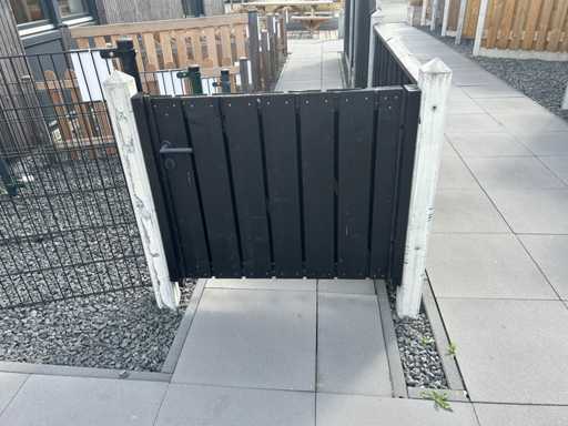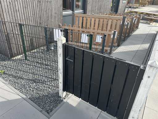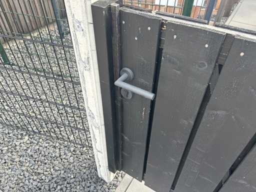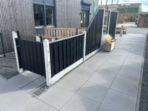showmodel hout betonschutting met zwarte tuinschermen; 1 scherm 180x180cm; 1 gaaselement met houten rand; 1 afbouwscherm; 1 laagscherm; 1 lage tuinpoort. Hoogte schutting ca. 200cm aflopend naar 100 cm. Inclusief betonpalen; door koper zelf netjes en vakkundig te demonteren.