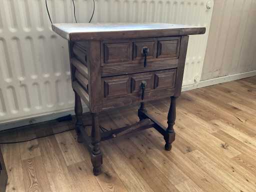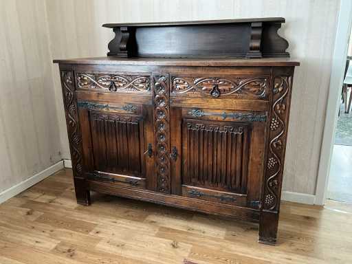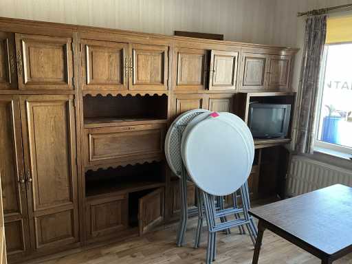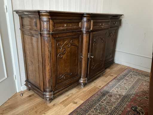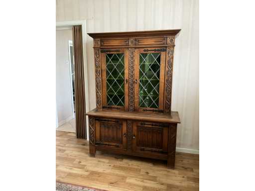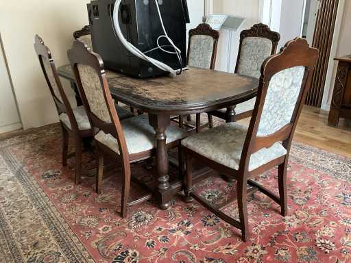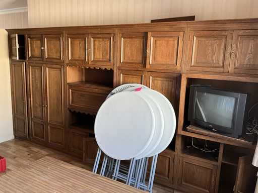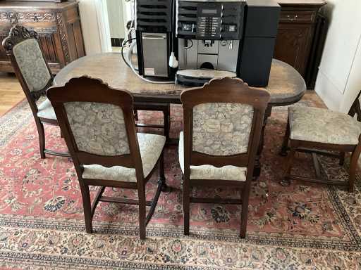 Houten eetkamer set bestaande uit uitschuifbare tafel BxDxH: 180x90x75cm, 6 stoelen, wandkast BxDxH: 187x63x105cm, wandkast BxDxH: 134x52x120cm, vitrinekast BxDxH: 135x50x184cm, bijzetkastje en wandkast BxDxH: 420x40x210cm
