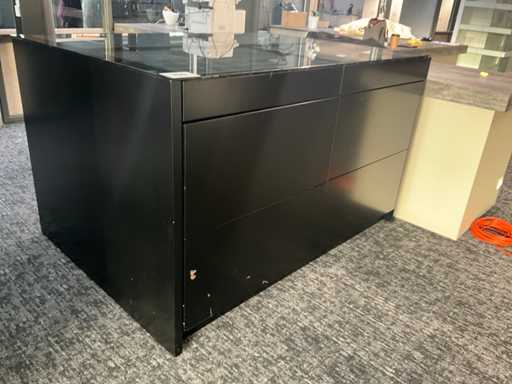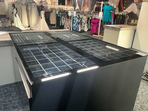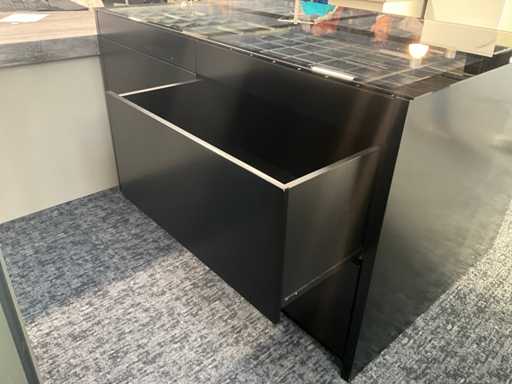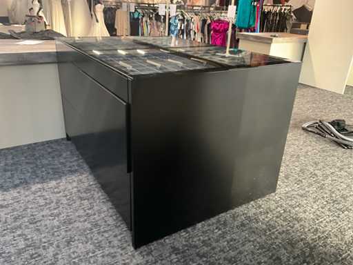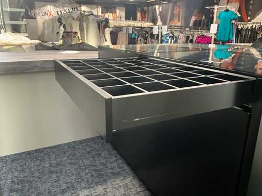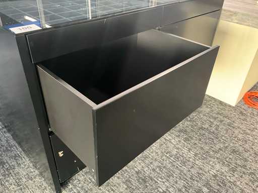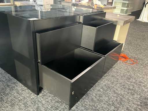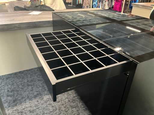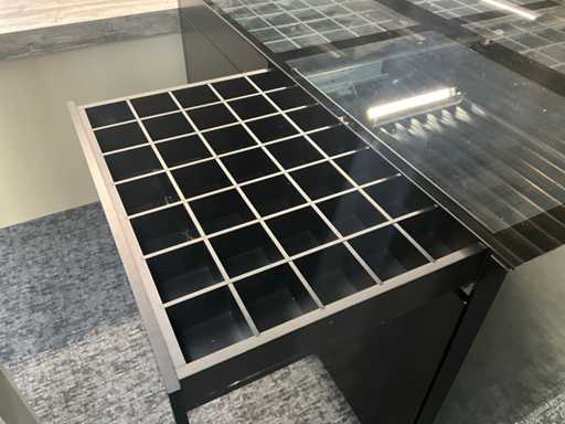 Langs beide zijden voorzien van 6 schuiven, totaal 12 laden waarvan bovenaan 4 laden elk voorzien van 35 verdeelvakken en glazen blad bovenaan.