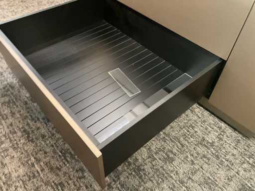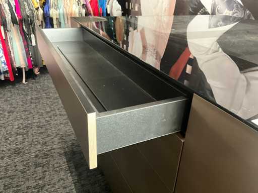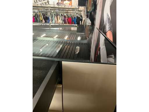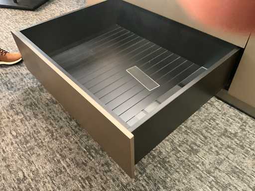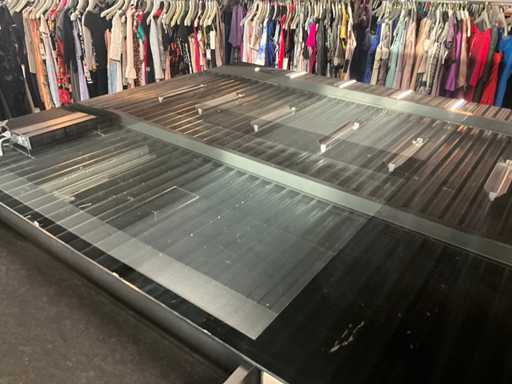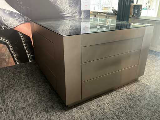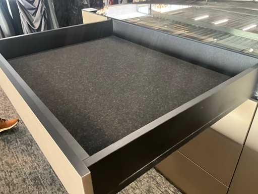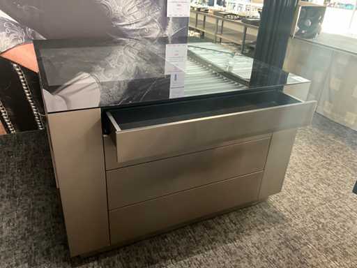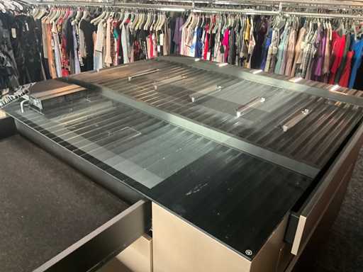 Langs alle 4 de zijden voorzien van 4 schuiven, totaal 16 laden waarvan 4 laden met glazen blad bovenaan.