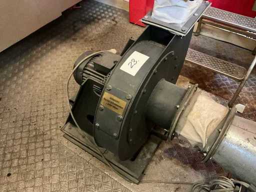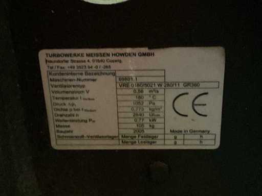 Procescentrifugaalventilator Howden / Turbowerke Meißen, type VRE 0180/5021 W 280/11 GR360, volumedoorvoer ca. 0,56 m³/s, middentemperatuur tot 180 °C, druktoename ca. 1.052 Pa, asvermogen ca. 0,77 kW, bouwjaar 2005, massa ca. 105 kg. Rechtstreeks aangedreven door de VEM driefasige motor K21R 90 S 2, ca. 1,5 kW, 230/400 V, 50 Hz, gemonteerd op een stalen basisframe. Compacte hetelucht-/afzuigventilator voor industriële toepassingen,