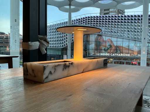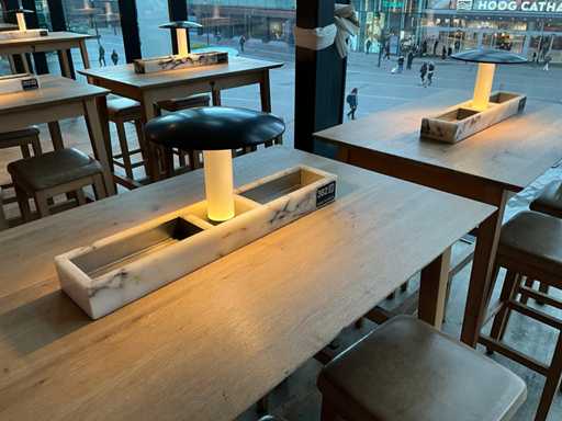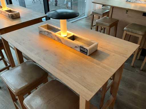 Bartafel met marmeren opbouw en verlichting en 4 barkrukken. De tafel is reeds ontkoppeld van de vloer en elektra. Hiervoor gelden de additionele kosten.