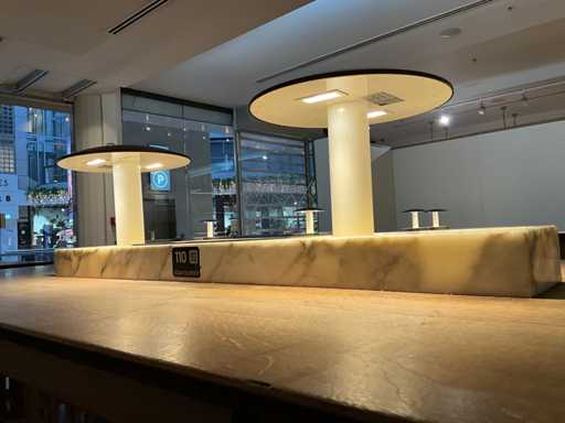 Bartafel met marmeren opbouw en verlichting. De tafel is reeds ontkoppeld van de vloer en elektra. Hiervoor zijn de additionele kosten van toepassing.