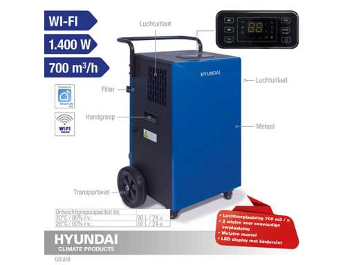 • Deze Hyundai industriële bouwdroger met WIFI is bij uitstek geschikt voor het verlagen van de luchtvochtigheid en het drooghouden van magazijnen, garages, gangen, was- en kleedruimten. Ook geschikt om opgeslagen elektronische apparatuur, documenten en medicijnen te beschermen tegen vocht, erosie en schimmels.