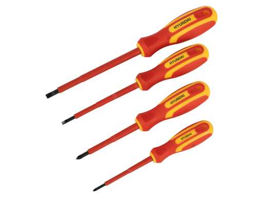VDE HYUNDAI schroevendraaierset met ergonomische gevormde handgreep en geheel geïsoleerde stalen kling. Tegen corrosie beschermde zwart geoxideerde tip. De antislip handgreep is vervaardigt uit twee componenten materiaal en voorzien van een ophangoog. De schroevendraaiers zijn getest naar EN60900:2004 tot 1000 V en voorzien van tip-identificatie op de handgreep, zo kiest u de juiste schroevendraaier voor elk type schroef. • GS/VDE gekeurd tot 1000V • Tip-identificatie op de handgreep • Ergonomisch gevormde handgreep - Handvat: PP en TPFI - Materiaal: Chrome Vanadium - SL0.8x4.0x100 mm - SL1.0x5.5x125 mm - PH0x75 mm - PH1x80 mm - Spanningszoeker: 125-250 V