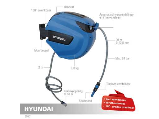 Zelfoprollend! •180° graden draaibaar • Incl. wandsteun • Efficiënt en eenvoudig besproeien van uw tuin. • Tuinslang rolt automatisch op. • Bevestigingsbeugel voor aan de muur bijgeleverd. • Inclusief 4-delige tuinsproeiset. - Model: 58601 - EAN: 8718502586015 - Zwenkingsgraad: 180° - Lengte slang: 30 m - Diameter slang: 1/2” / 12,5 mm - Lengte aanvoerslang: 2 m - Max. druk: 24 bar - Kraankoppeling: ½ + ¾ - Afmeting (lxbxh): 46 x 25 x 40 cm - Gewicht: 9,8 kg - Makkelijk los te halen om vorstvrij te bewaren. -