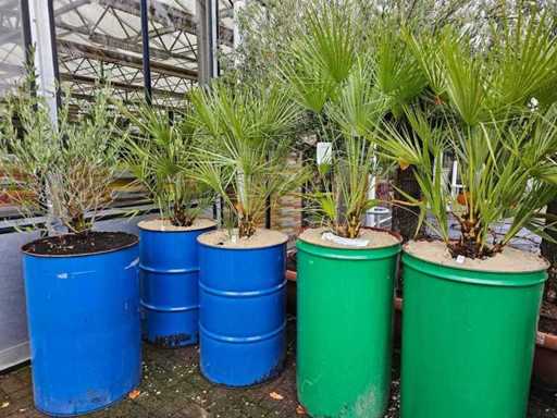 Breng een mediterraan tintje in je buitenruimte met deze indrukwekkende Chamaerops humilis, ook wel bekend als de Europese dwergpalm. Met een indrukwekkende hoogte van ongeveer 200 cm en zijn karakteristieke, meerstammige groei is het een absolute blikvanger voor elke tuin of terras. De palmboom is geplant in een stevige, kleurrijke stalen vaas in een moderne upcyclingstijl en afgewerkt met een decoratieve laag licht zand. Deze variëteit is bijzonder bestand en vorstbestand tot ongeveer -10°C, wat het een ideale keuze maakt voor buitengebruik.