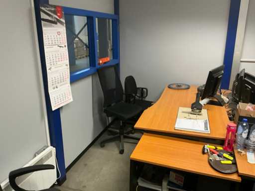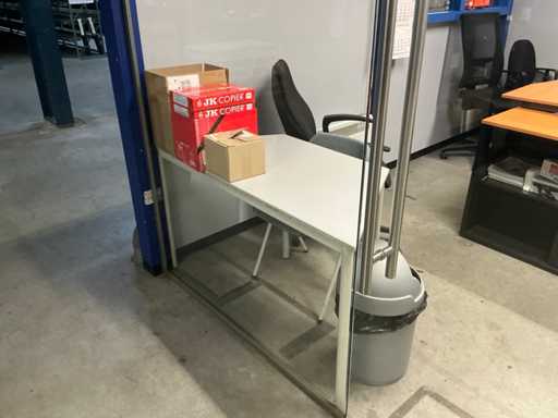 Bestaande uit 2 bureaus, 4 bureaustoelen, koelkast, tafel, 2 ladeblokken, 4 monitoren, Zebra GK420D labelprinter. Dit kavel dient leeg opgeleverd te worden.