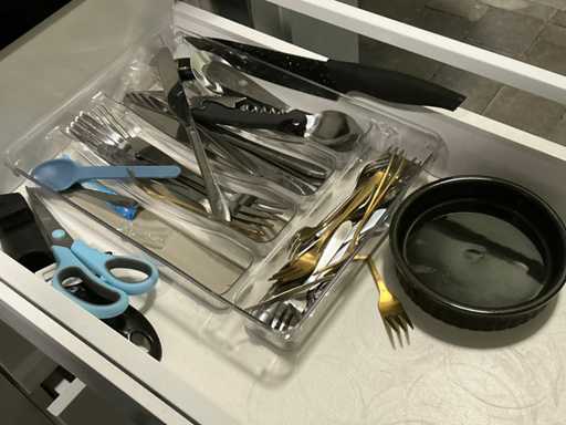 Waaronder bestaande uit 1 koffiezetapparaat KRUPS Dolce Gusto, 1 waterkoker HOME, 1 Airfryer, 1 microgolfoven DOMO, 1 chrome elektrische vuilnisbak en kleine partij diverse tafel porselein, glazen, mokken en servies,