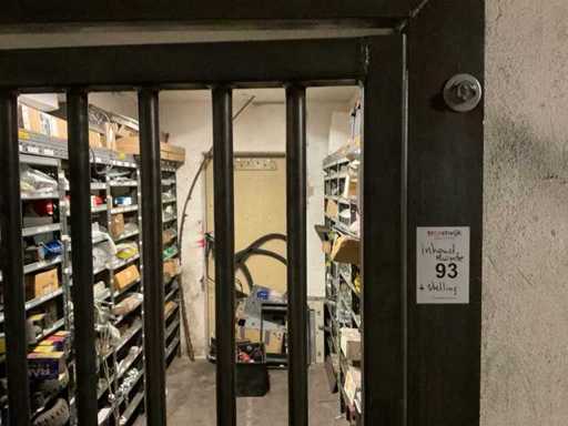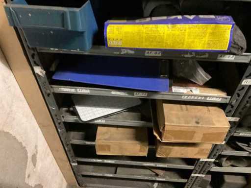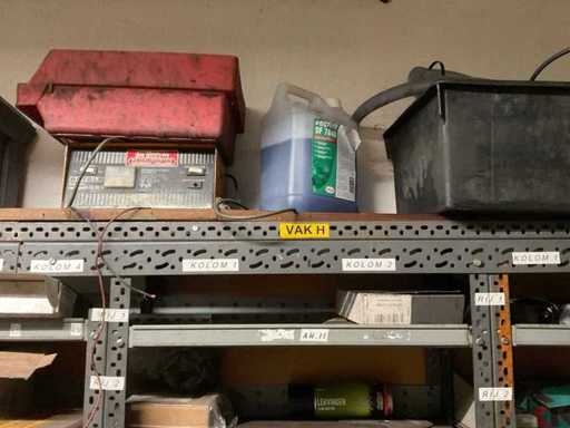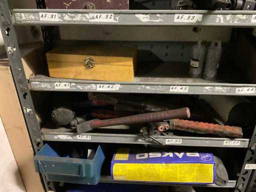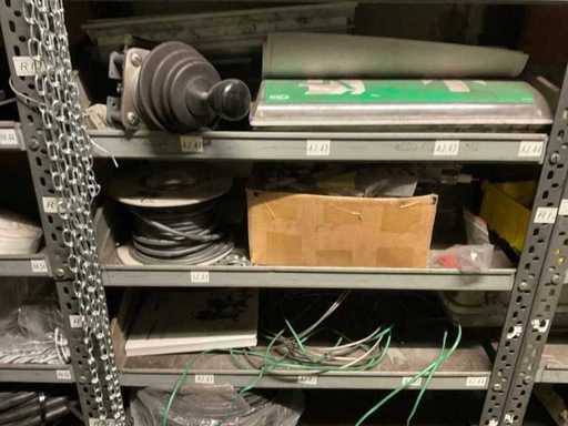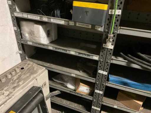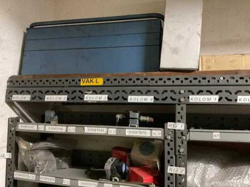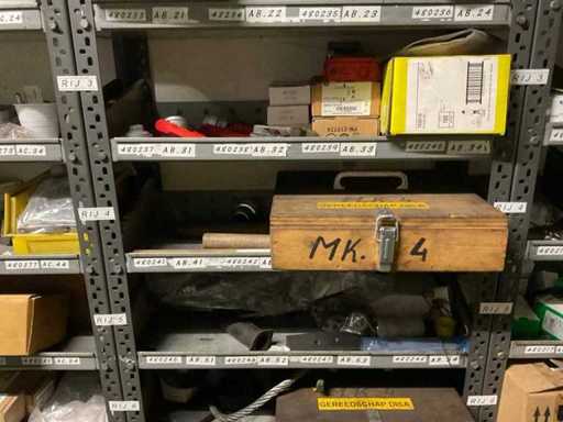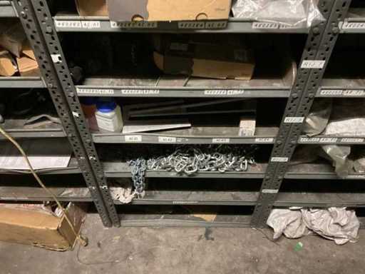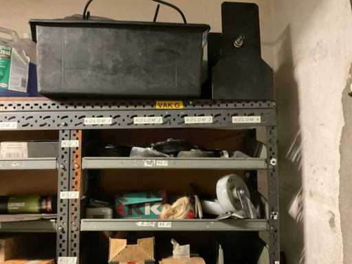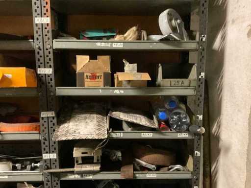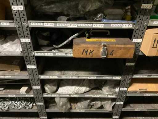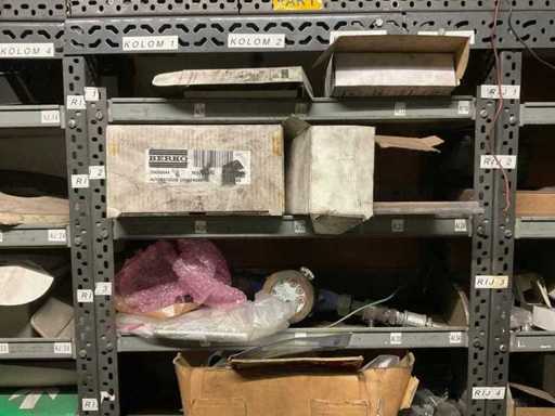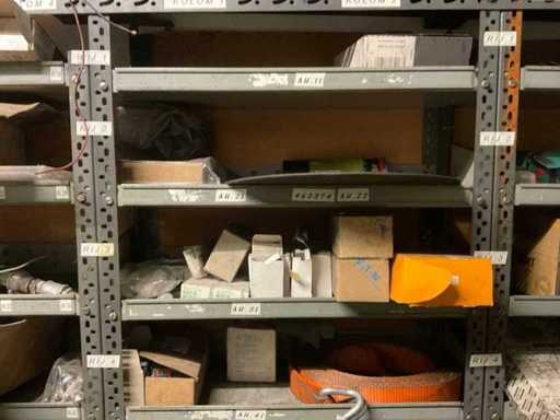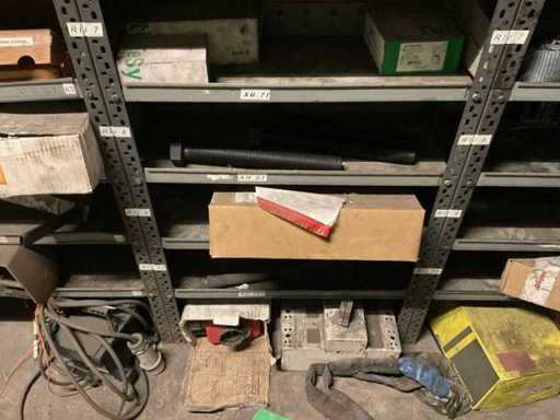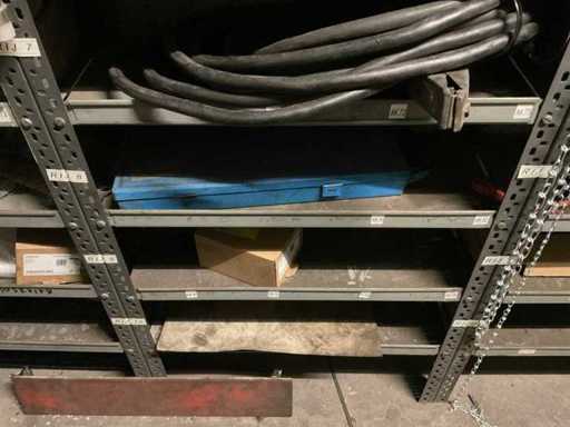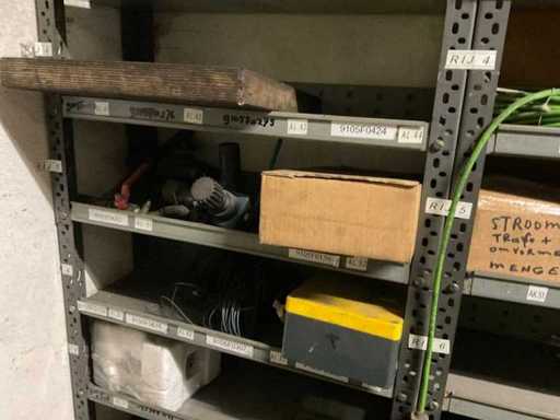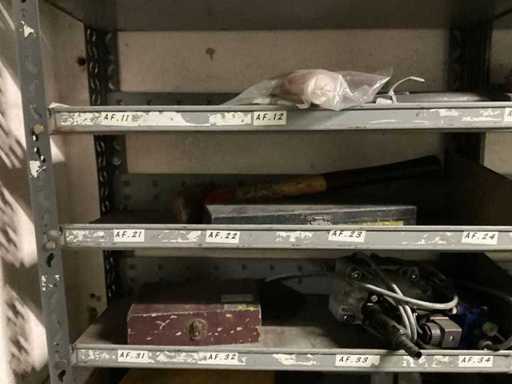 Inhoud ruimte bestaande uit o.a, spanbanden, elektra materiaal, bevestigingsmaterialen, meters, machinetoebehoren, speciaal gereedschap, handgereedschap etc, in en inclusief stellingen.