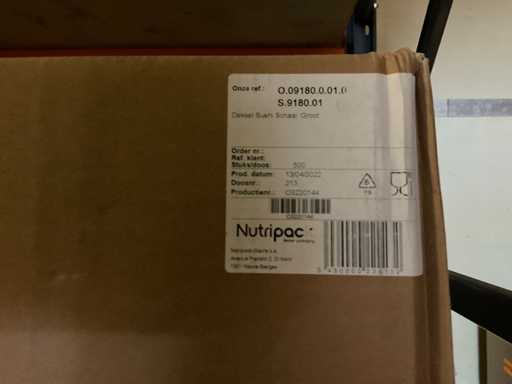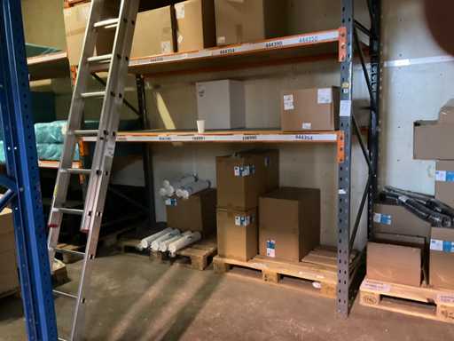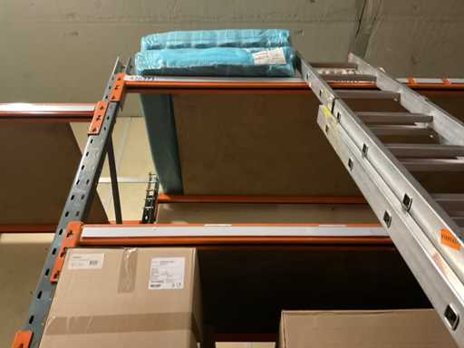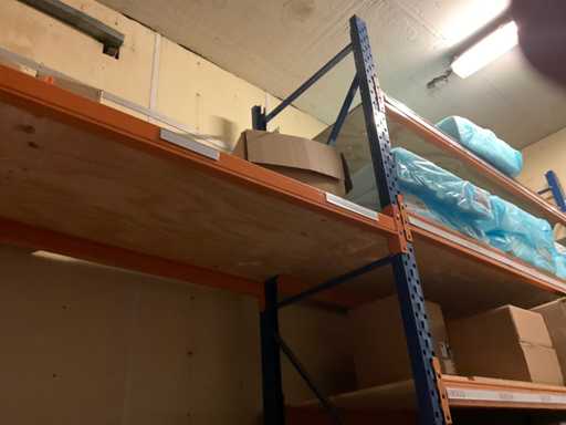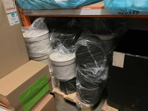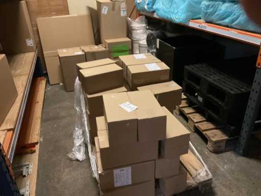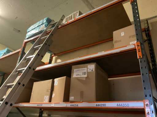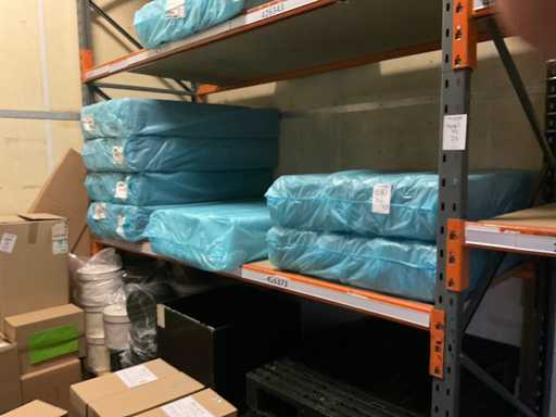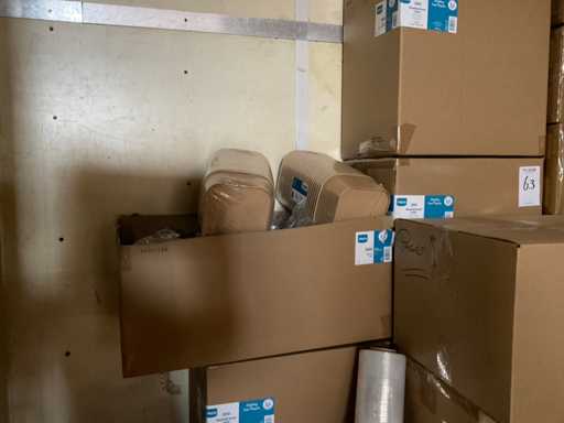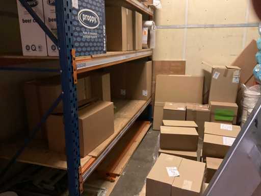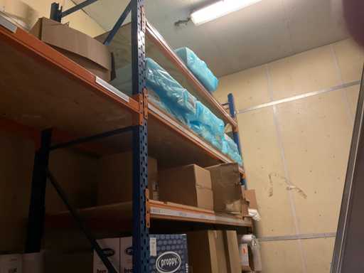 Deel op pallets en inhoud stellingen Bestaande o.a. uit ijsbekers, deksel sushi trays, 7-vaks schalen, Fresh Cling, poetsrollen, damastpapier. Exclusief stelling. Inclusief pallets. Let op, kavels liggen ook op hoogte, ladder aanwezig.