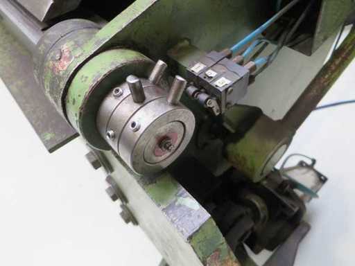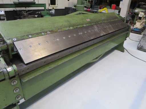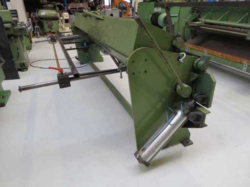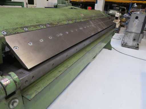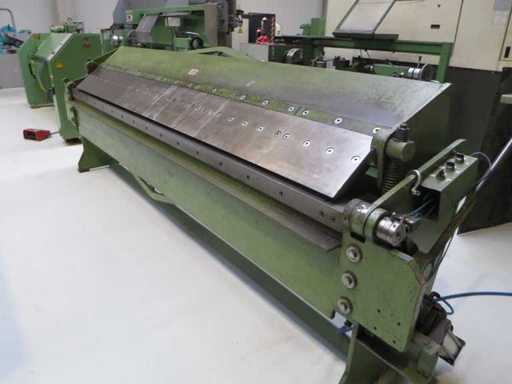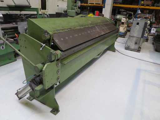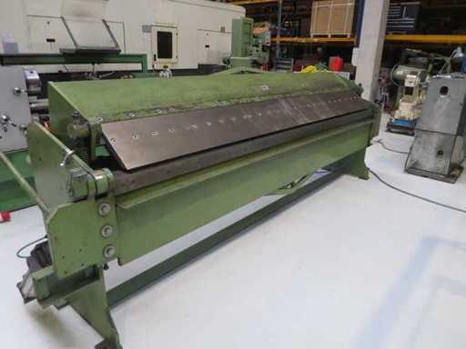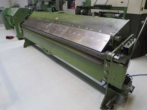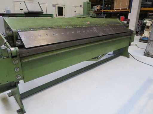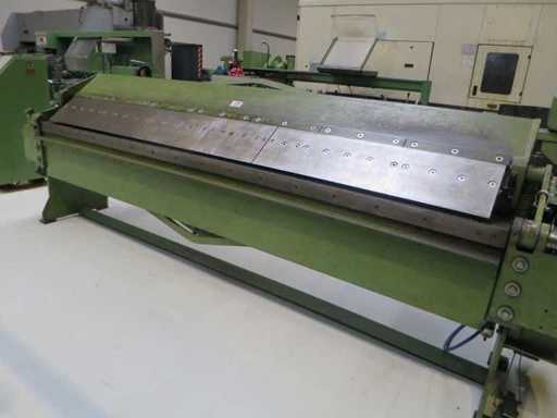 Segment draaibare buigmachine pneumatisch>br>- handmatige achterspoor maximaal 830 mm>br> buighoek voorselectie via eindschakelaar>br>plaatbreedte 3000 mm>br>plaatdikte 2,0 mm>br>kolombreedte 3140 mm>br>openingsbreedte 80 mm>br>totale vermogensbehoefte kW>br>machinegewicht ca. 1,45 t>br>ruimtebehoefte ca. 3,8 x 1,5 x 1,6 m