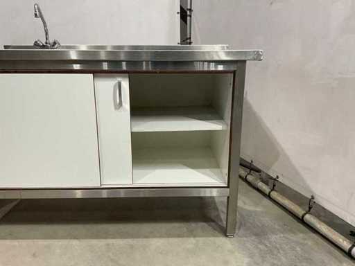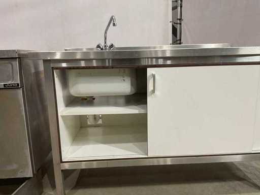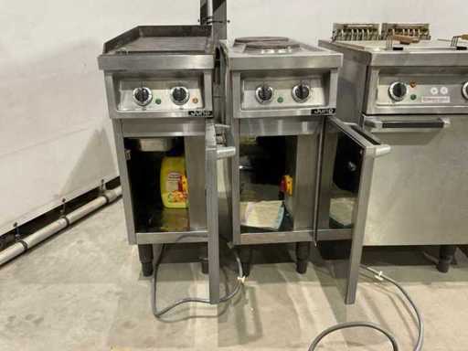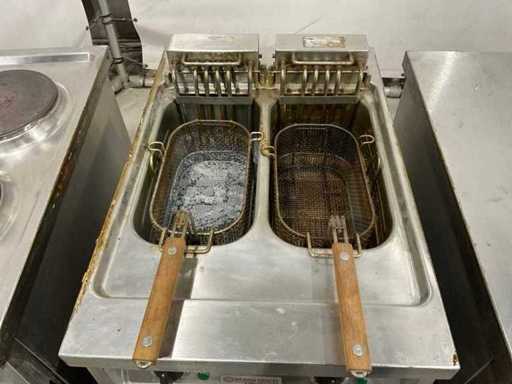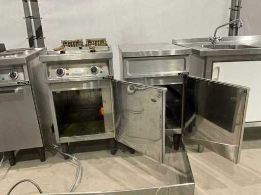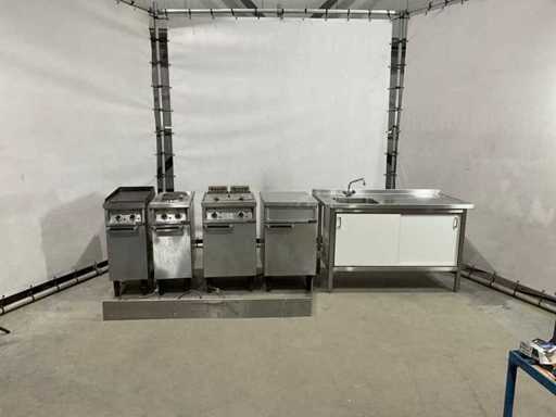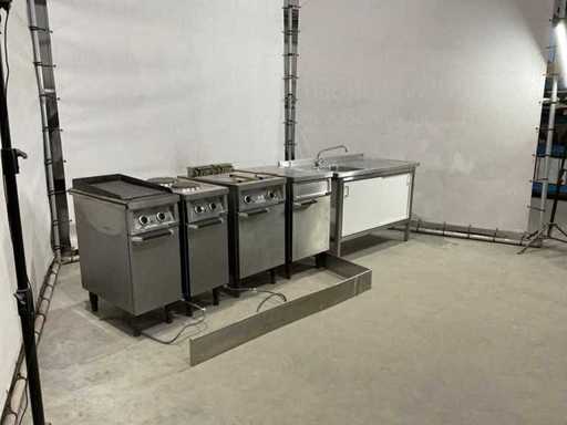 bakplaat unit circa 95 cm hoog; 35 cm breed; 75 cm lang; 2 pits kookplaat unit circa 89 cm hoog; 35 cm breed; 75 cm lang; dubbele frituur circa 97 cm hoog; 50 cm breed; 75 cm lang; neutrale unit circa 88 cm hoog; 50 cm breed; 75 cm lang ; keukenblok circa 140 cm breed ; 91 cm hoog; 75 cm lang