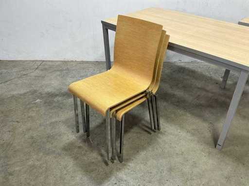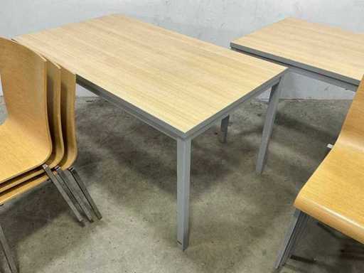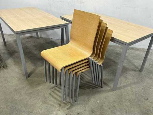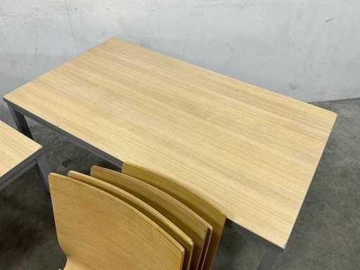 Bestaande uit 2 tafels 140x80x75 cm en 8x stoel 45x45x85 cm.