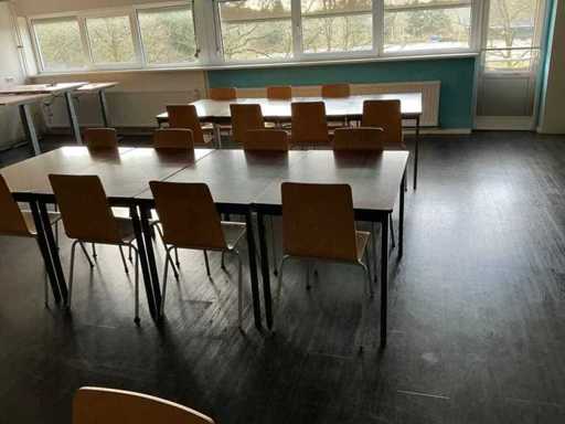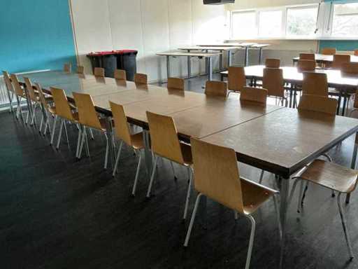 26 tafels (in diverse afmetingen) en 46 stoelen, inclusief diverse prullenbakken