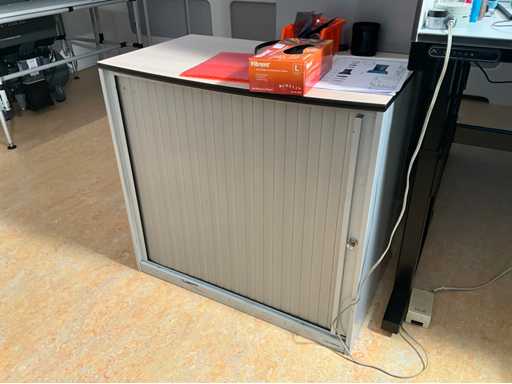 Bestaande uit 2x roldeurkast, afmeting: H195xB120xD45cm, H75xB80xD45cm en 1x werktafel, H76xB80xL160cm; Zonder inhoud kasten en spullen op tafel