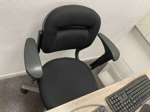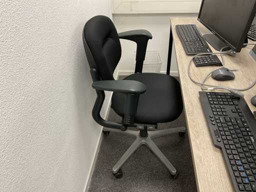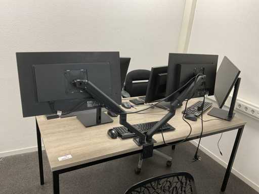 1x bureau met 5 schermen en 4 toetsenborden en muis; 1x bureaustoel en papierkorf