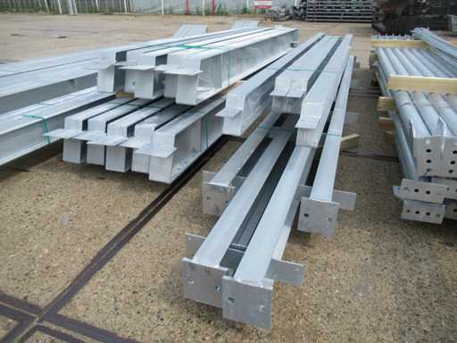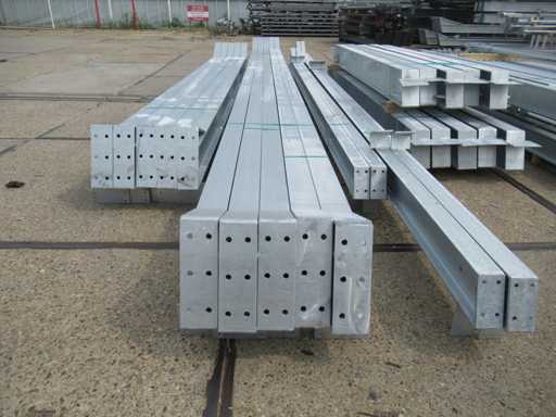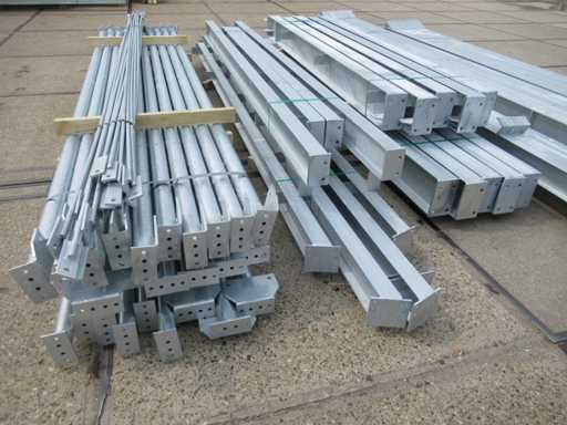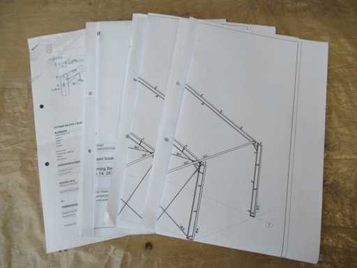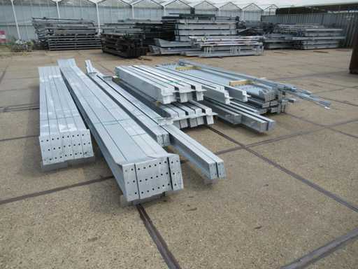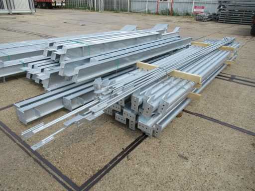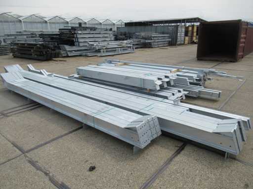 Nederlandse productie; kapschuur model met een vrije overspanning; spanten h.o.h. 5000mm; staalberekeningen; staaltekeningen; montagetekeningen; ankerplan; staal genummerd volgens montageplan; dakhelling 20 graden; 5 sets tussenspanten IPE 270/240; 2 sets eindspanten IPE 200/180 met windstijlen; voorzien van drukkokers; windverbanden; gordinglippen; bouten en moeren; meestort ankers; staalconstructie volgens productnorm EN1090 (Certificaat na aankoop verkrijgbaar); kavel ligt netjes transportklaar en dient met 1 trailer opgehaald te worden; kavel wordt gratis met een heftruck geladen