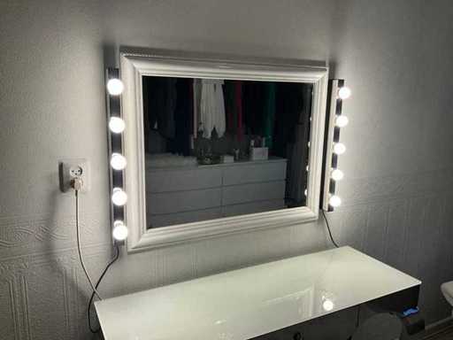 Afmeting tafel 120x41x79 cm voorzien van 1 lade, melkglazen topblad en chroomstalen onderstel, grijze zitpoef , wandspiegel afmeting 90x70 cm, en 2 stuks wandverlichting met elk 5 lichtbronnen