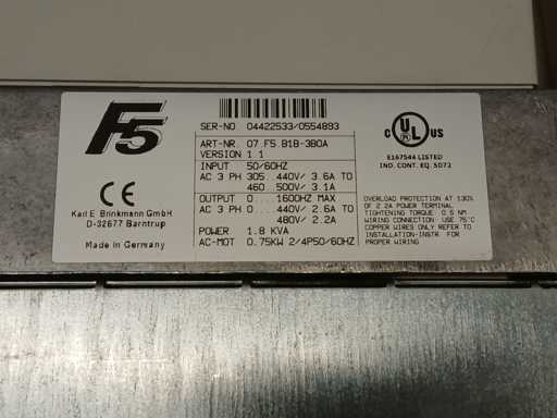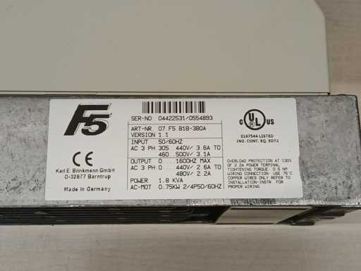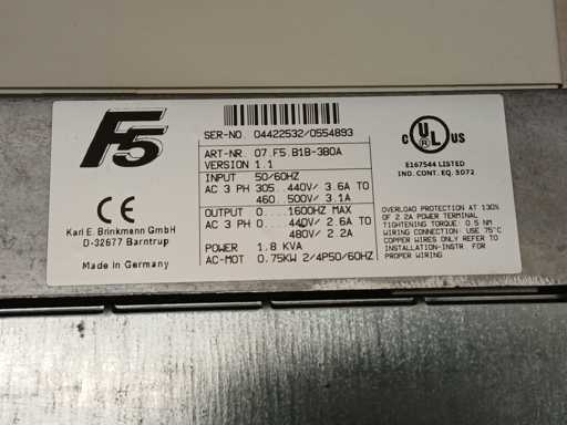 KEB COMBIVERT F5 frequentieomvormers, Model 07.F5. B1B-3B0A. Ingang 3-fasen 305–500 V wisselstroom, uitgang tot 1600 Hz, nominale motorvermogen 0,75 kW.