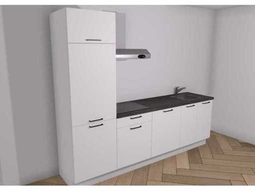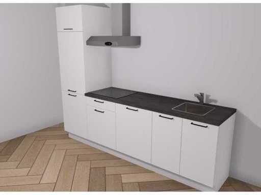 Deze keuken is uitgevoerd in de kleur wit met een werkblad van watervast verlijmt kunststof in de kleur Beton zwart.