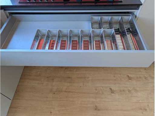 Conditie: gebruikt; afmetingen linkerdeel circa 270x62x93 cm; afmetingen rechterdeel circa 311x62x184 cm; reeds gedemonteerd en ingepakt op pallets. (afstapelen, omruilen of statiegeld per pallet); pallets zijn niet inbegrepen; statiegeld betalen bij afhalen, of pallets afstapelen; werkblad niet ingepakt op pallets (26-2DE-04107)