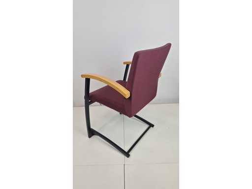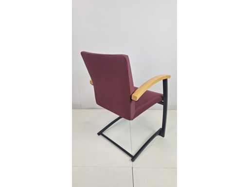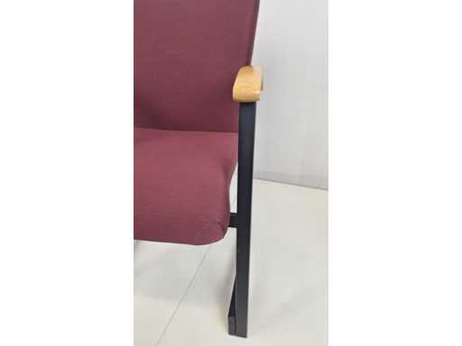 stapelbaar vierpoots onderstel in metaal kleur zwart, zitting en rugleuning bekleed met stof kleur bordeauxrood/antraciet gestreept, armleuningen in natuurlijk hout, stapelbaar, lichte gebruikssporen mogelijk foto's indicatief