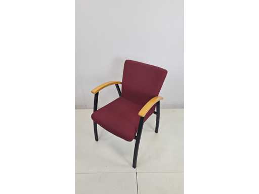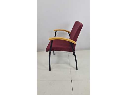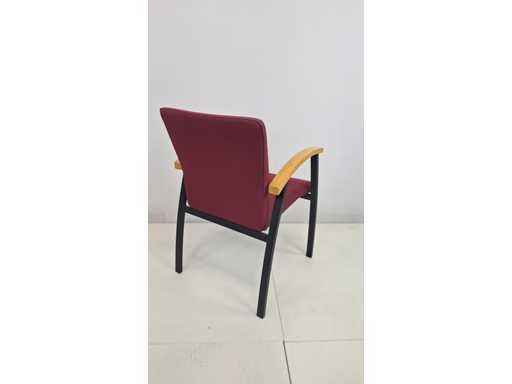 stapelbaar vierpoots onderstel in metaal kleur zwart, zitting en rugleuning bekleed met stof bordeauxrood gestreept, armleuningen in natuurlijk hout, stapelbaar, zeer goede staat