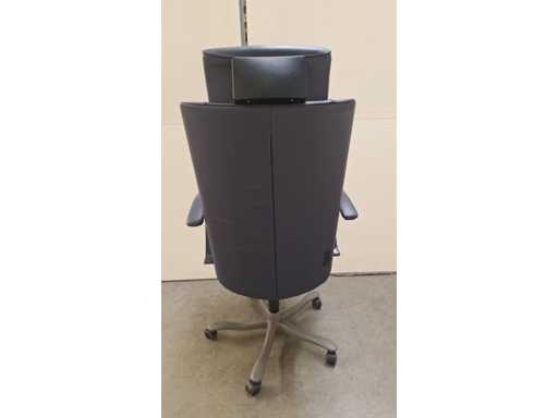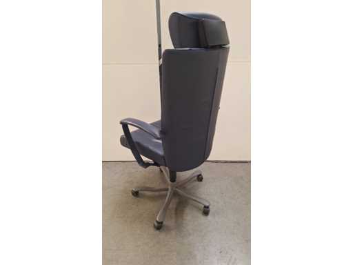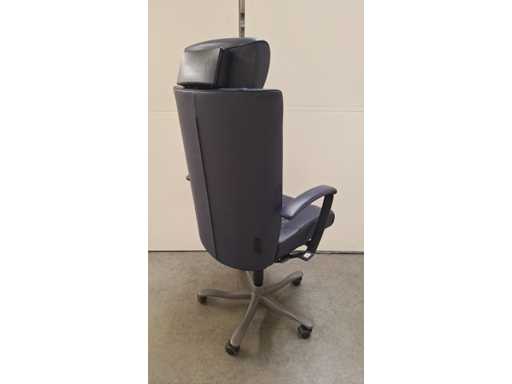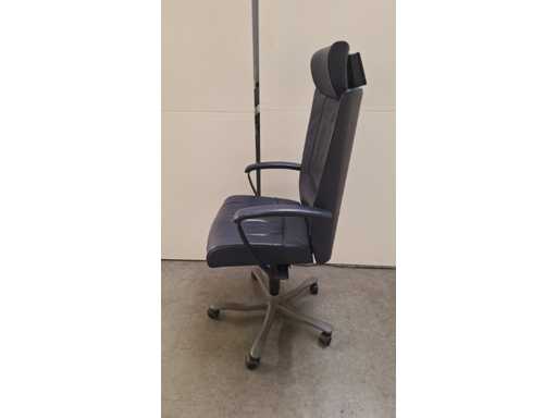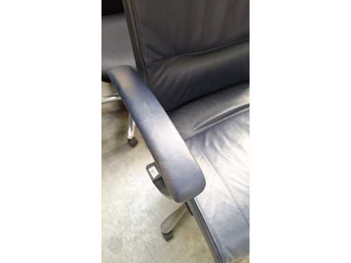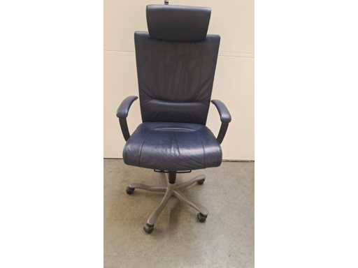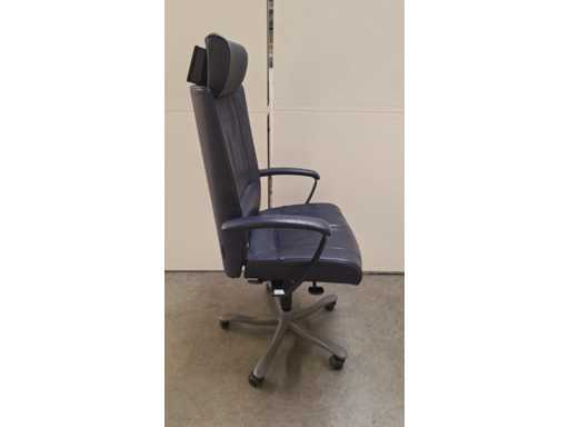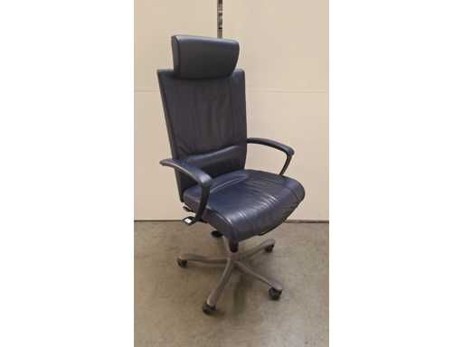 stervoet in aluminium voorzien van PHD zwenkwielen (ook geschikt voor delicate ondergrond), bekleding in leder kleur donkerblauw, armleuningen bekleed met leder kleur donkerblauw, verstelbare hoofdsteun bekleed met leder kleur donkerblauw, in hoogte verstelbaar, freefloat/synchro mechanisme met gewichtsinstelling, zeer comfortabele ergonomische directie bureaustoel, in goede technische staat maar leder vertoont gebruikssporen (zie foto's)