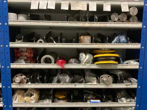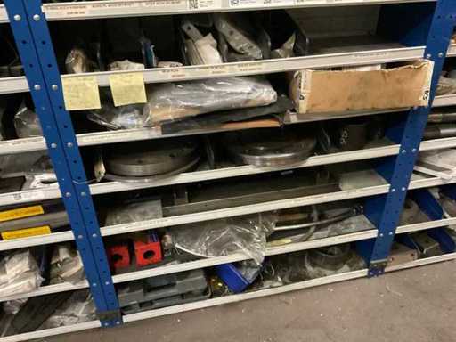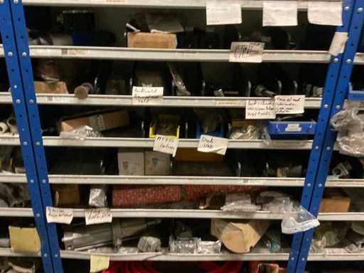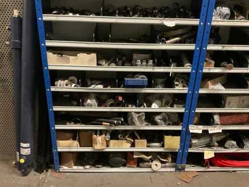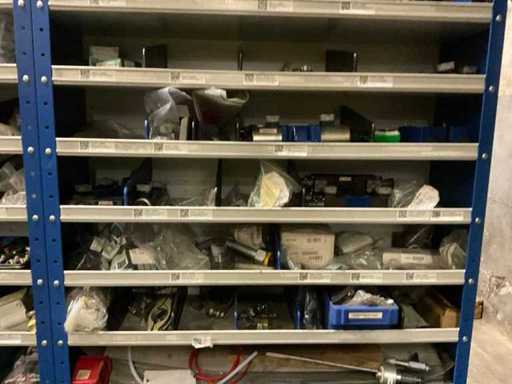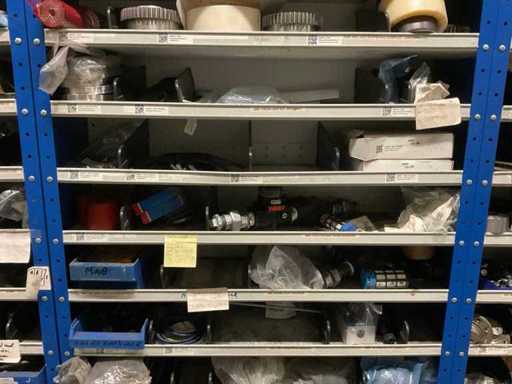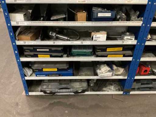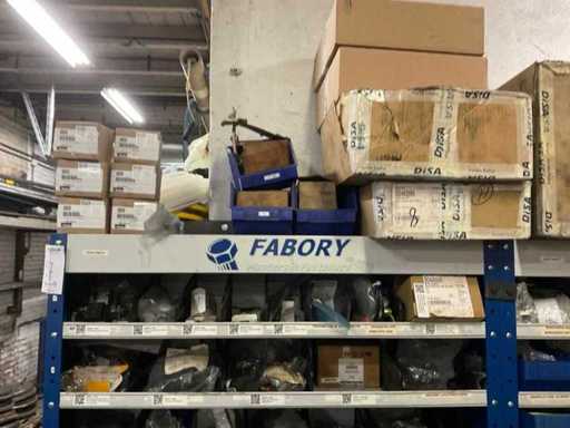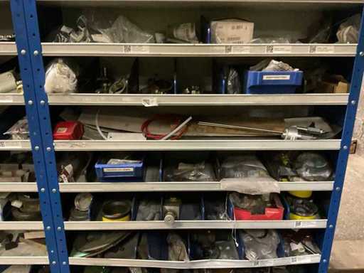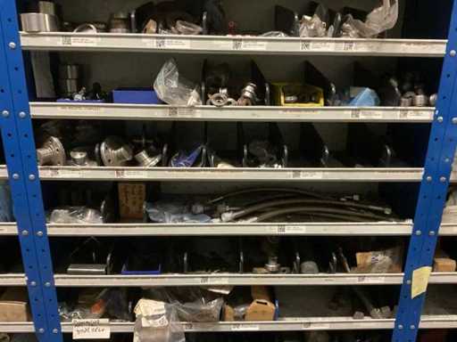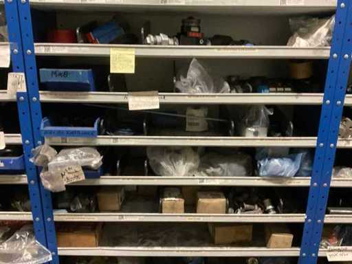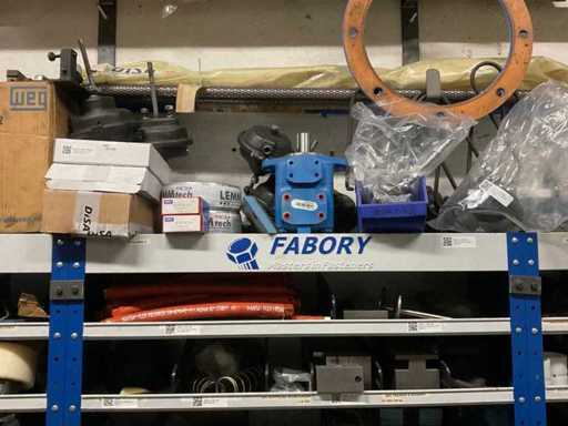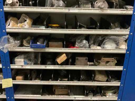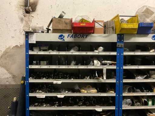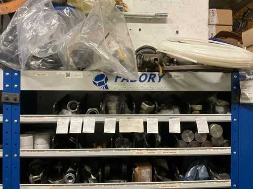 9 kasten met inhoud bestaande uit kleinmateriaal t.b.v. machines w.o. Slangklemmen,ventielen, speciaal gereedschap, bevestigingsmaterialen, koppelingen, lagers, slangen, travers, pennen, assen, in en inclusief 9 ‘ Fabory’ kasten.