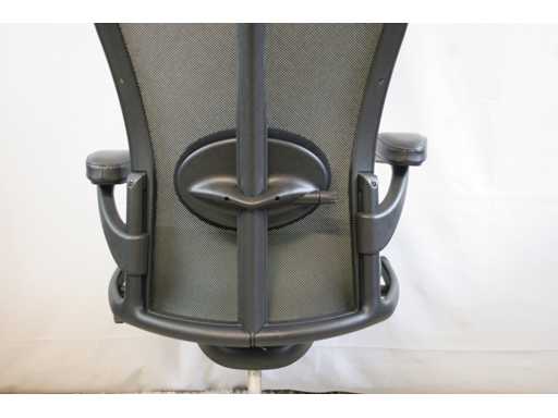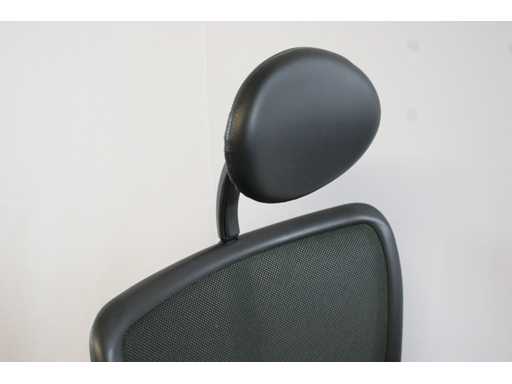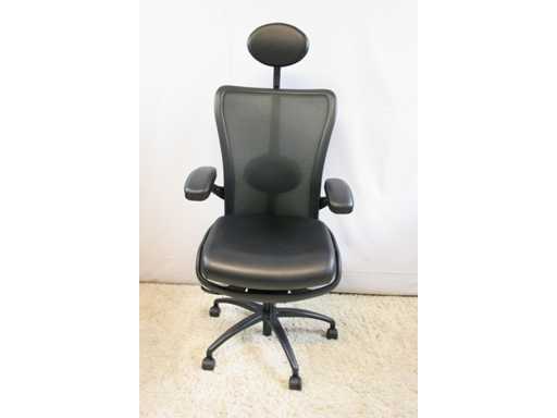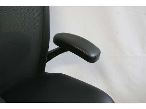 stervoet in aluminium kleur Zwart voorzien van standaard zwenkwielen, rugleuning bekleed met netweave kleur Zwart, zitting in leder kleur Zwart, in hoogte verstelbaar, verstelbare hoofdsteun, synchrone mechanisme met gewichtsinstelling, instelbare zitdiepte, 4 D armleuningen met zachte opdek bekleed met leder, in hoogte verstelbare rugleuning, verstelbare lendesteun, in goede staat, technisch nazicht en onderhoud gehad, gereinigd