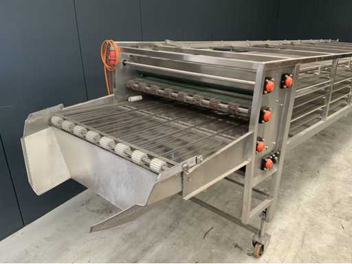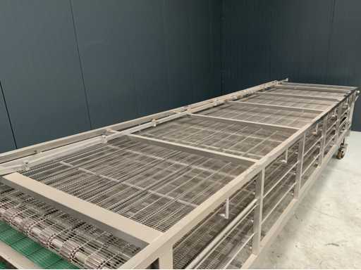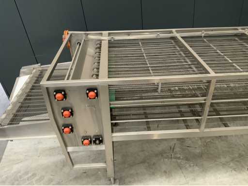Drie laags rvs koelband afmetingen: 7000 x 1360mm. Compleet met aandrijving en geleiding rails. Verrijdbaar.