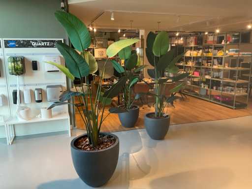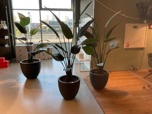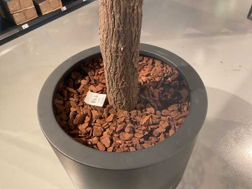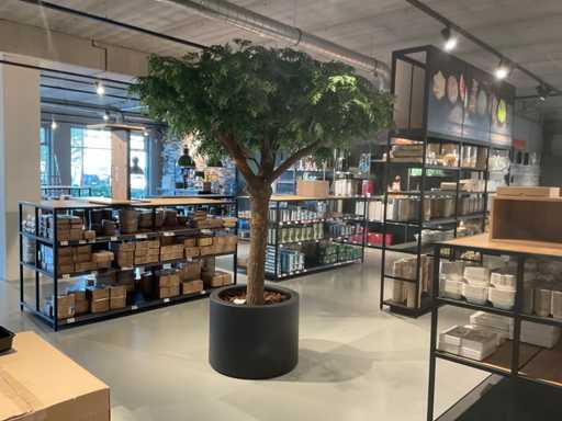 1 boom ca. 200x220 cm inclusief pot ca. 80x60 cm, 3 planten ca. 150x120 cm, inclusief 2 potten ca. 50x45 cm en 1 pot ca. 60x55 cm.