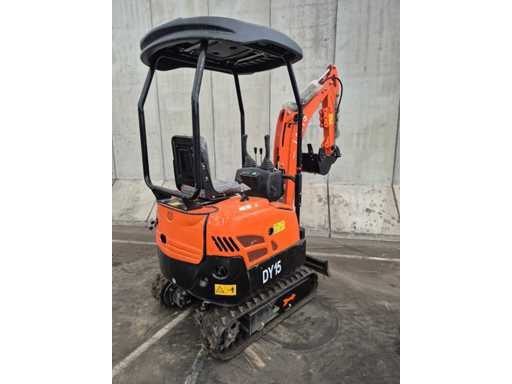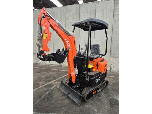 LADYS DY15 mini-graafmachine – ongebruikt – dieselmotor – hydraulisch systeem met joystickbediening – open machineraam met rolbeugel – werksnelheid 0–4 km/u – rijsysteem op rubberen rupsen – machinegewicht 1150 kg – maximale graafdiepte 1800 mm – maximale graafhoogte 2740 mm – maximale graafradius 3070 mm – uitgerust met hydraulisch dozerblad – compacte bouw – geschikt voor lichte graafwerken, tuinaanleg en bouwtoepassingen op krappe locaties – CE-gecertificeerd