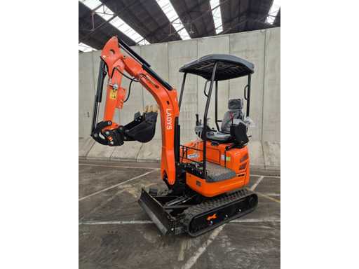LADYS DY20 mini-graafmachine – ongebruikt – aangedreven door dieselmotor – open machineraam met rolbeugel – voorzien van joystickbediening – rupsaandrijving – uitgerust met hydraulisch duwblad – geschikt voor lichte tot middelzware graafwerkzaamheden – voorzien van werklampen en waarschuwingssignaal – CE-gecertificeerd – compact ontwerp, eenvoudig te bedienen, inzetbaar in tuinbouw, bouw en terreinonderhoud