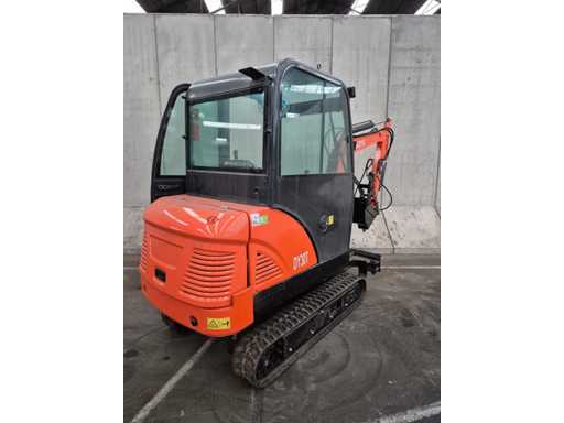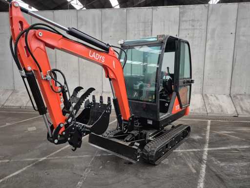 LADYS DY30 mini-graafmachine – ongebruikt – dieselmotor – joystickbediening – gesloten machineraam met cabine – rupsaandrijving – uitgerust met hydraulisch duwblad – geschikt voor graafwerk en grondverzet – voorzien van werklampen en waarschuwingssignaal – CE-gecertificeerd – robuust, compact en geschikt voor diverse toepassingen in bouw en terreinbeheer