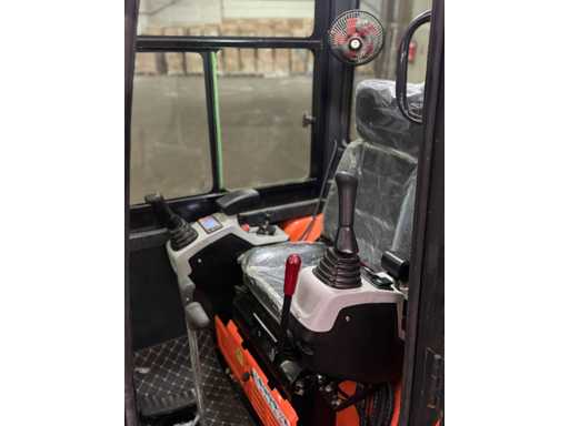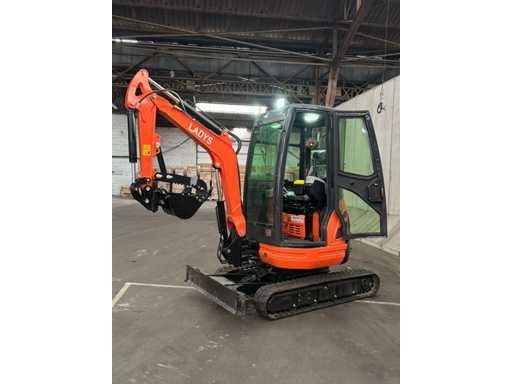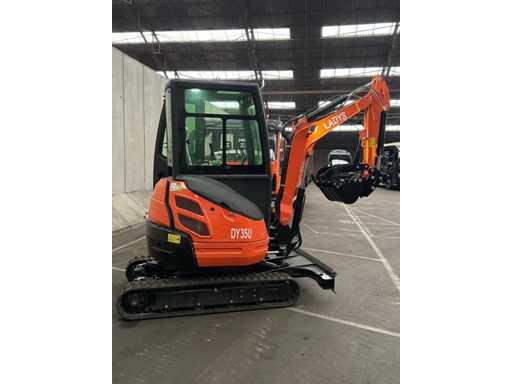 LADYS DY35 mini-graafmachine – ongebruikt – dieselmotor – joystickbediening – gesloten machineraam met cabine – rupsaandrijving – uitgerust met hydraulisch duwblad – geschikt voor graafwerk en grondverzet – voorzien van werklampen en waarschuwingssignaal – CE-gecertificeerd – robuust, compact en geschikt voor diverse toepassingen in bouw en terreinbeheer