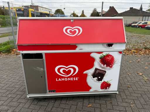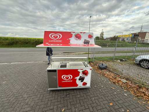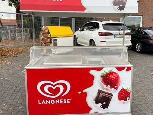 Mobiele verkoopstand met geïntegreerde vriezer, merklogo "LANGNESE" en opvouwbaar reclamedak.