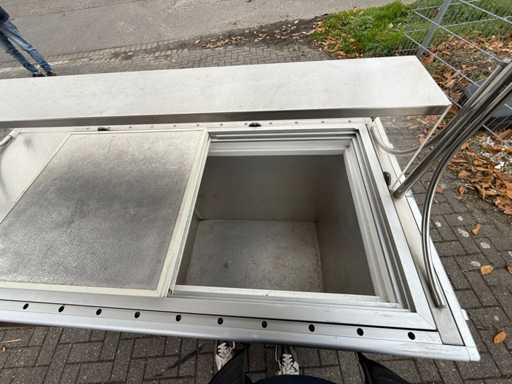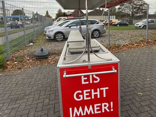 Robuuste constructie, oprolbaar, met RVS werkblad en reclameborden "IJs werkt altijd!".