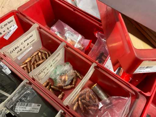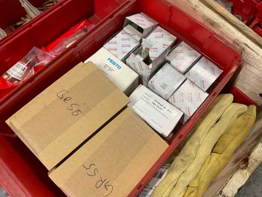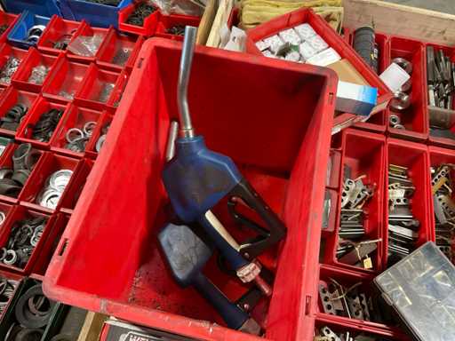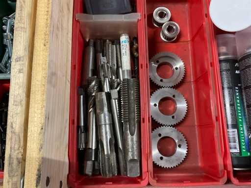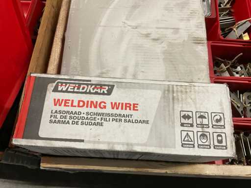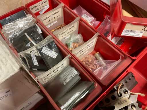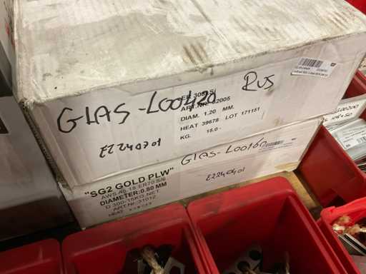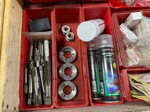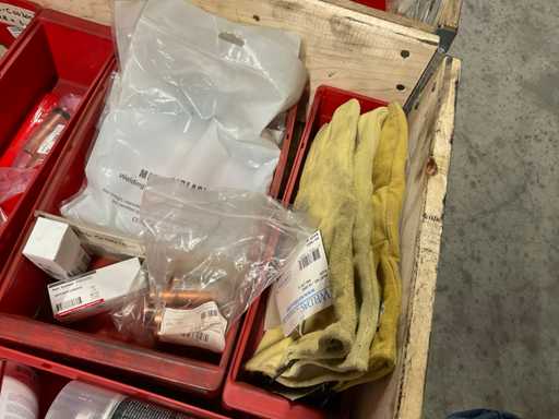 Diverse onderdelen waaronder lasdraad, pistolen, gasmondstukken, las glasplaatjes. Diverse spantangen en hulpstukken