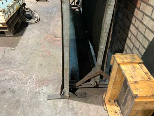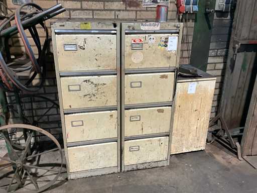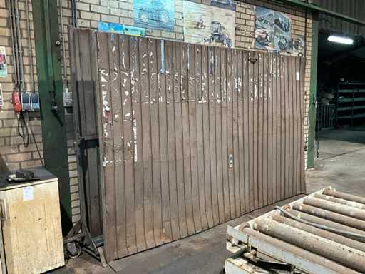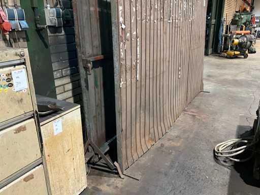 Materiaal: staal. Zelfbouw, voormalige garagekanteldeuren, 1x afmeting bxh circa 330x215cm voorzien van lastafel, 1x afmeting bxh circa 330x215cm, inclusief kasten en koelkast