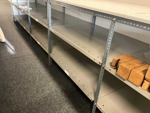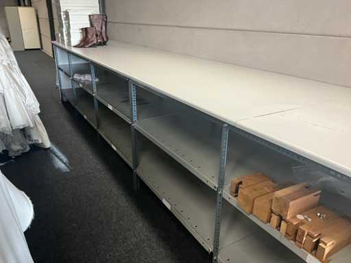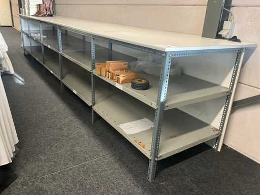 Met bovenaan houten bovenblad en onderaan metalen legbordstelling telkens voorzien van diverse leggers en achteraan in houten wanduitvoering.