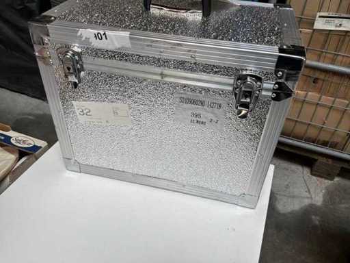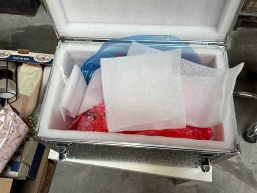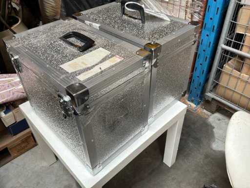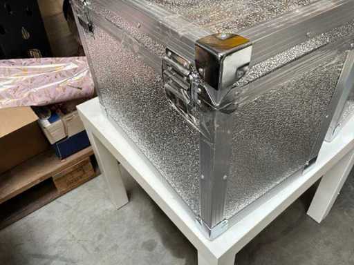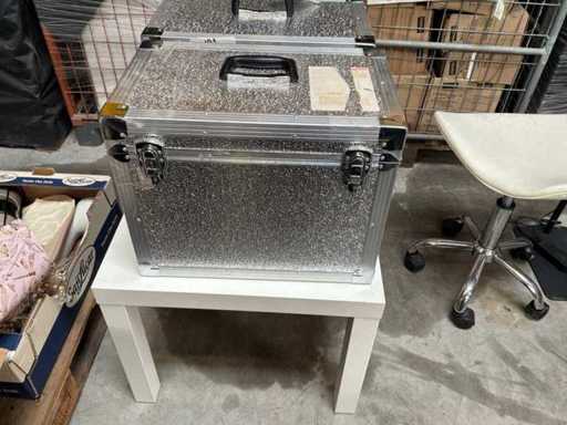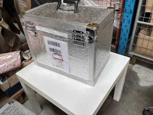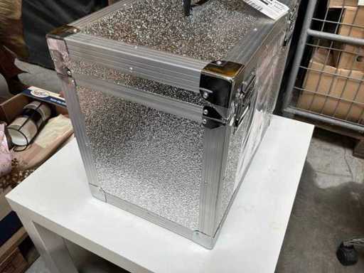 Afmetingen flightcase: 44 x 27 x H 35 cm. Inclusief wit bijzettafeltje met afmetingen: 55 x 55 x H 45cm.