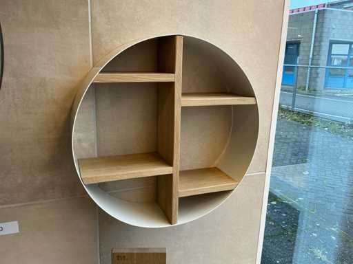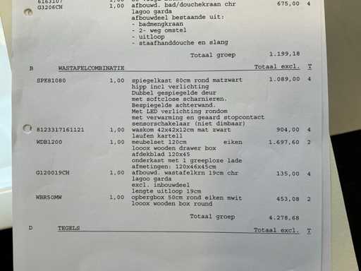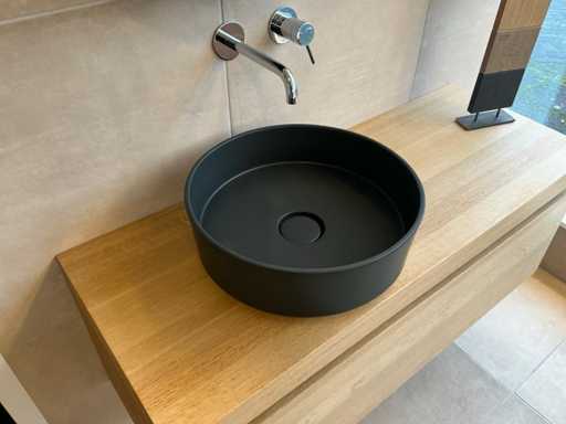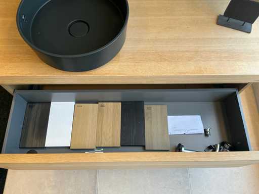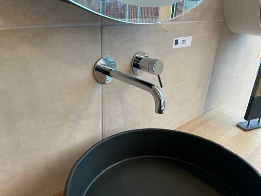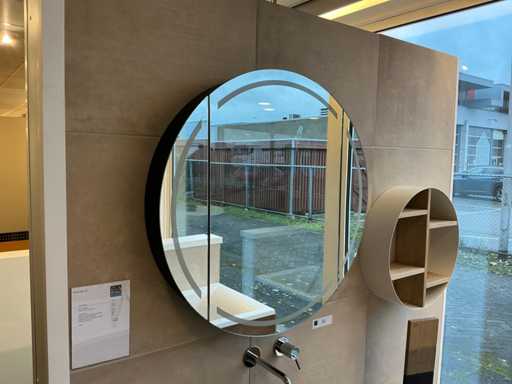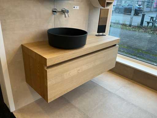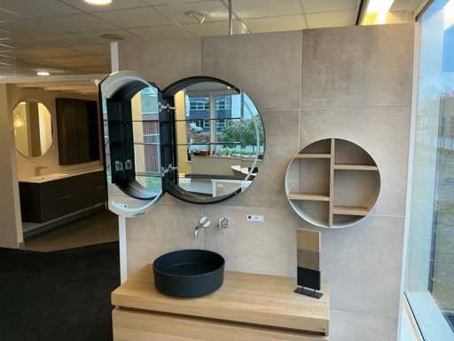 Bestaande uit een Hipp Spiegelkast met verlichting 80cm, Laufen Kartell waskom 42x42x12cm, Lagoo Garda wastafelkraan opbouwdeel zonder inbouwgedeelte, Meubelset 120cm Wooden drawer box 120x45cm met 1 greeploze lade, Looox Wooden Box Round 50cm.