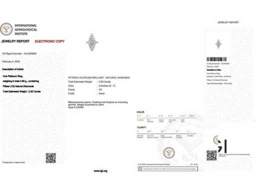 Luxe Design Ring Natuurlijke Diamant 2,60 karaat in platina 4,89 gr. met 15 natuurlijke ronde briljante diamanten 2,60 karaat. Topkleur en zuiverheid E-F / VS. Gecertificeerd door IGI Laboratoire, een van de grootste internationale instituten voor de certificering en waardering van diamanten en edelstenen. Voor meer informatie, zie het certificaat. Het echte juweel is beter dan de foto's. Prijsschatting van de winkelier: 11.950.-